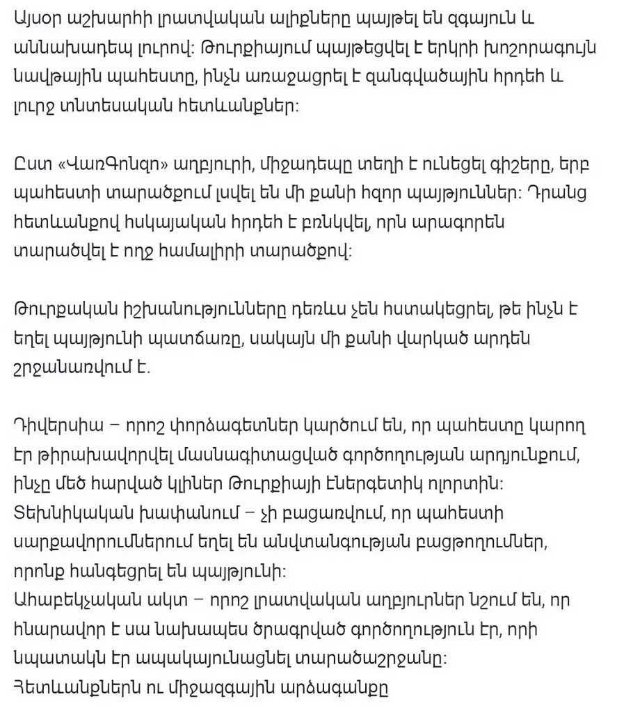 Сегодня мировые новостные каналы взорвались деликатными и беспрецедентными новостями. В Турции взорвалось крупнейшее в стране нефтехранилище, что привело к масштабному пожару и серьезным экономическим последствиям.