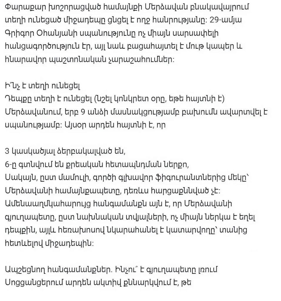 Инцидент произошел (укажите точную дату, если известна) в Мердзаване, когда столкновение с участием 9 человек закончилось убийством. Сегодня уже известно, что