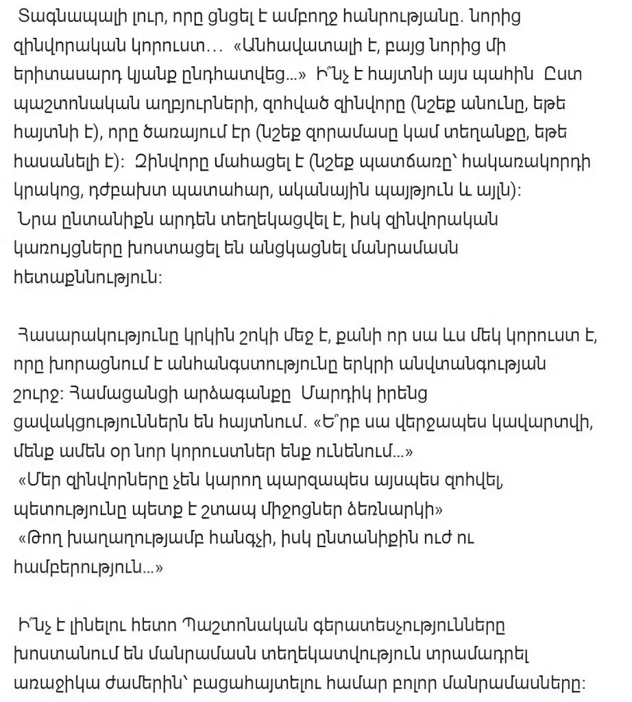 Тревожные новости, потрясшие все общество. Еще одна военная потеря… «Невероятно, но оборвалась еще одна молодая жизнь…» Что известно на данный момент? По официальным данным, погибший военнослужащий (укажите имя, если известно), проходивший службу в (укажите воинскую часть или место дислокации, если известно). Погиб военнослужащий (указать причину: огонь противника, несчастный случай, взрыв мины и т. д.).