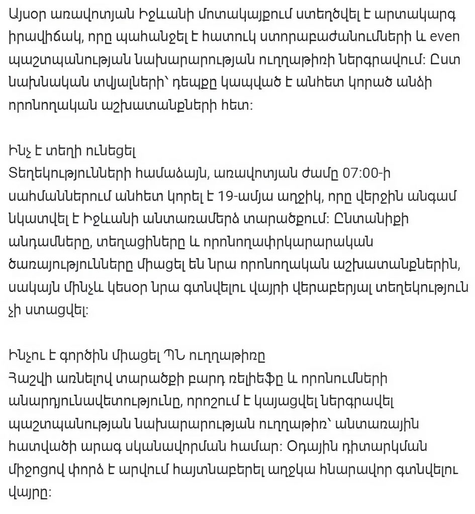 Около 6:30 утра в лесном массиве Иджевана пропала 19-летняя девушка. По словам членов семьи, последний раз с ним связывались поздно ночью, но позже его телефон стал недоступен. Первоначально поиски проводили местные силы, но серьезность ситуации потребовала вмешательства государственных служб.