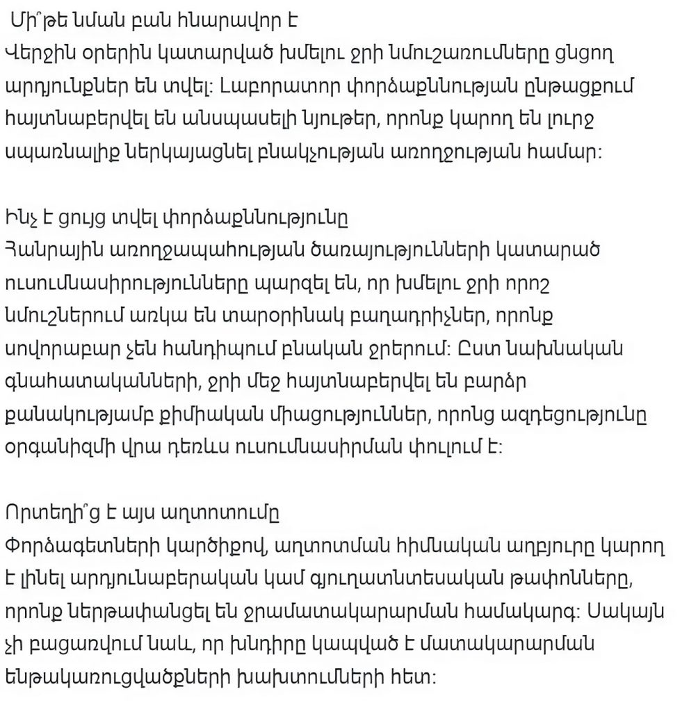 Анализы проб питьевой воды, проведенные в последние дни, дали шокирующие результаты. В ходе лабораторного исследования были обнаружены неожиданные вещества, которые могут представлять серьезную угрозу здоровью населения.