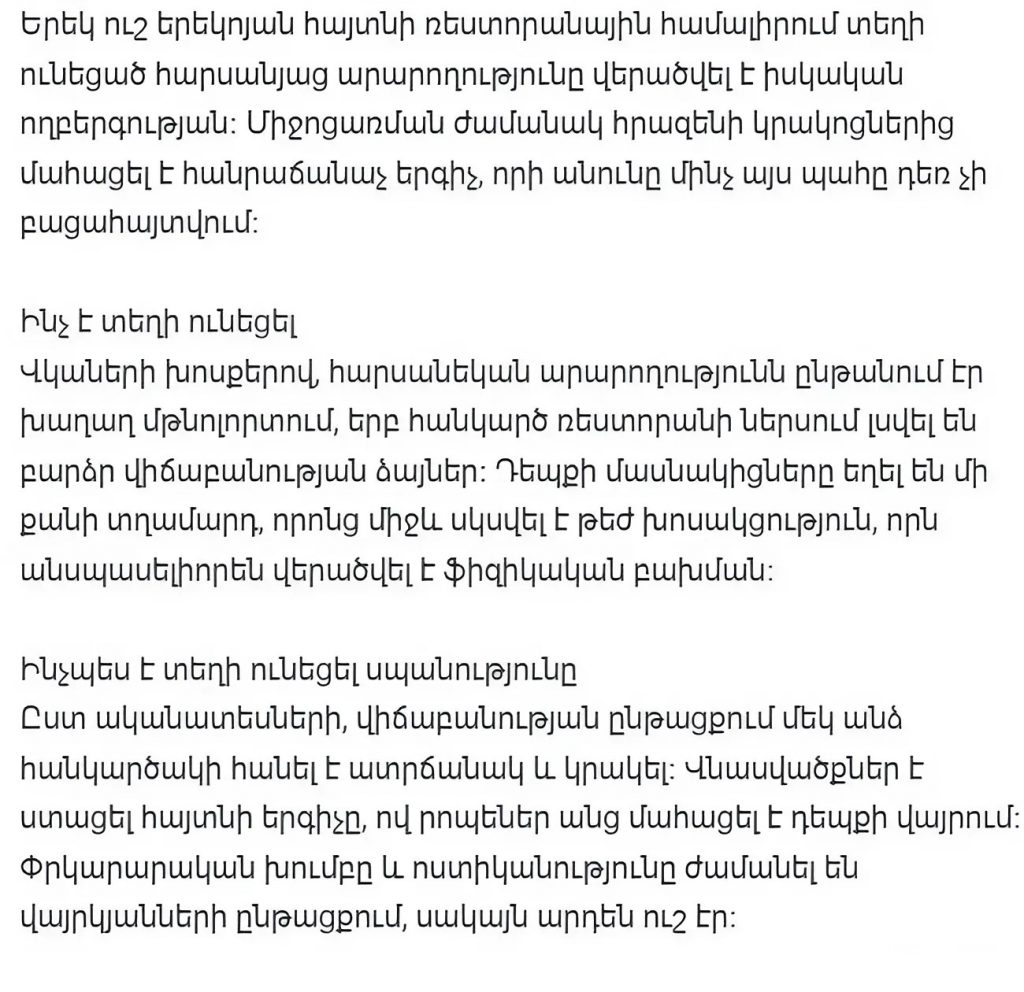 Свадебная церемония, состоявшаяся вчера поздно вечером в известном ресторанном комплексе, обернулась настоящей трагедией. Популярный певец, имя которого пока не разглашается, скончался от огнестрельных ранений во время мероприятия.