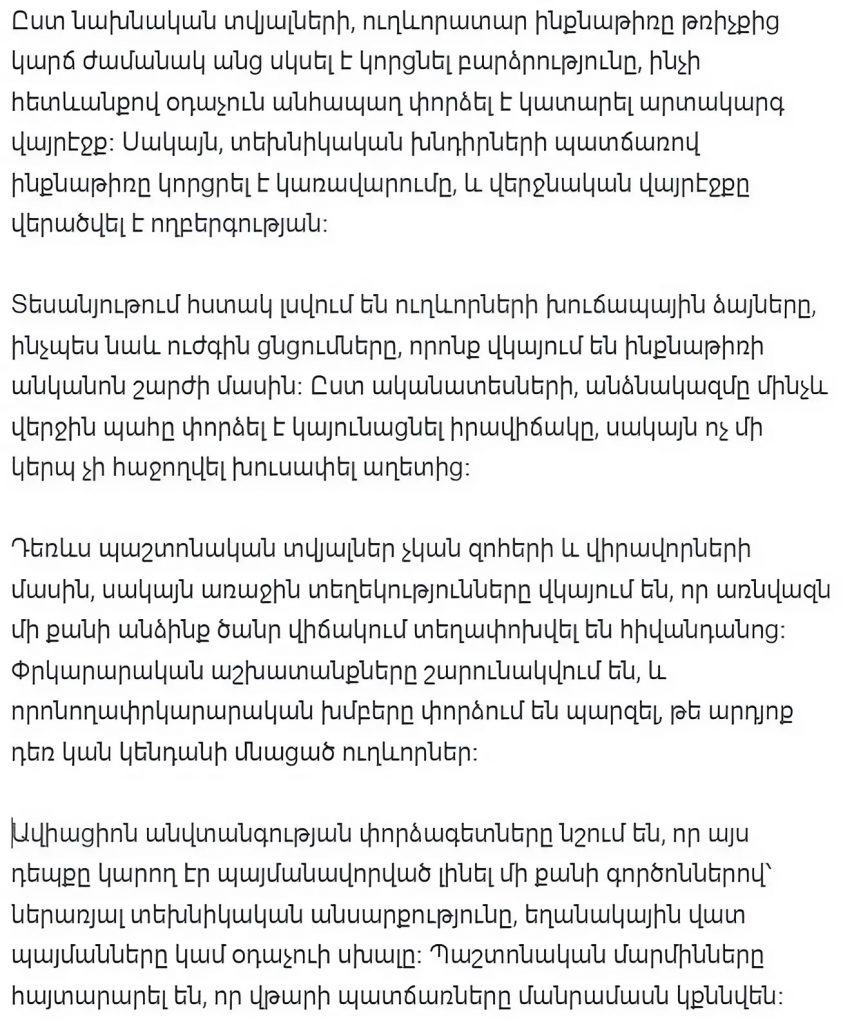 По предварительным данным, пассажирский самолет начал терять высоту вскоре после взлета, в результате чего пилот сразу же предпринял попытку совершить аварийную посадку. Однако из-за технических проблем самолет потерял управление, и финальная посадка обернулась трагедией.