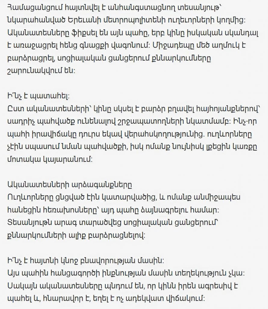 В сети появилось тревожное видео, снятое пассажирами ереванского метрополитена. Очевидцы запечатлели момент, когда женщина устроила настоящий скандал прямо в вагоне поезда. Инцидент вызвал резонанс, а обсуждения в социальных сетях не утихают.