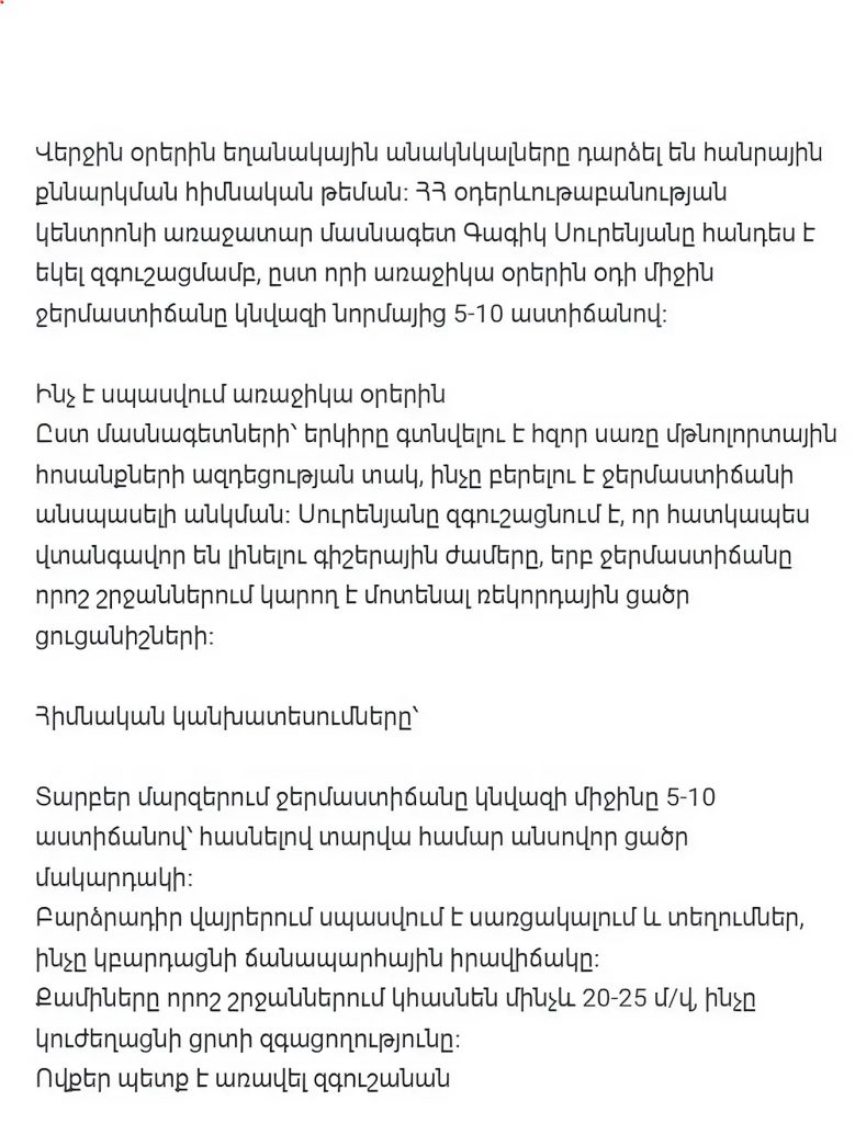 В последние дни сюрпризы погоды стали главной темой общественного обсуждения. Ведущий специалист Метеорологического центра РА Гагик Суренян предупредил, что в ближайшие дни средняя температура воздуха опустится на 5-10 градусов ниже нормы.