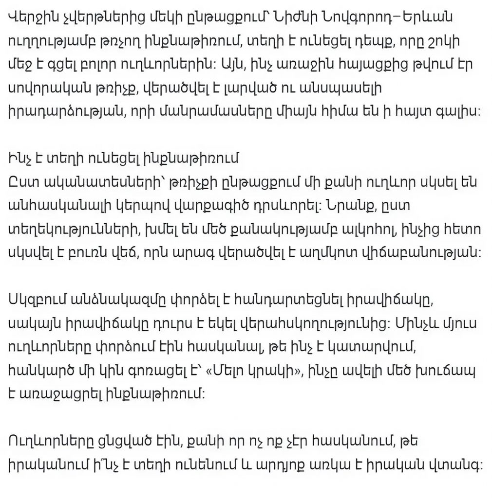 Во время одного из недавних рейсов на борту самолета, следовавшего из Нижнего Новгорода в Ереван, произошел инцидент, потрясший всех пассажиров. То, что на первый взгляд казалось обычным полетом, превратилось в напряженное и неожиданное событие, подробности которого выясняются только сейчас.