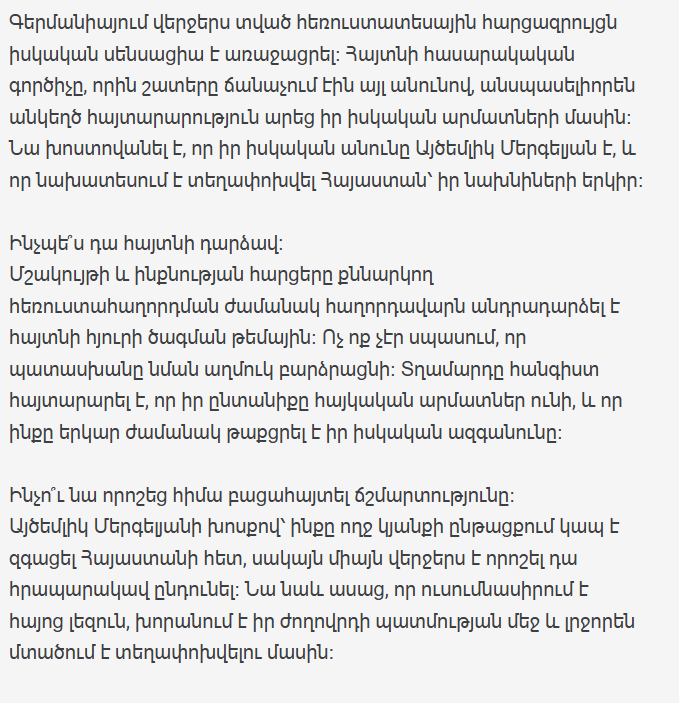 Недавнее телевизионное интервью в Германии стало настоящей сенсацией. Известный общественный деятель, которого многие знали под другим именем, неожиданно сделал откровенное заявление о своих истинных корнях. Он признался, что его настоящее имя – Айцемлик Мергелян, и что он планирует переезд в Армению, страну своих предков.