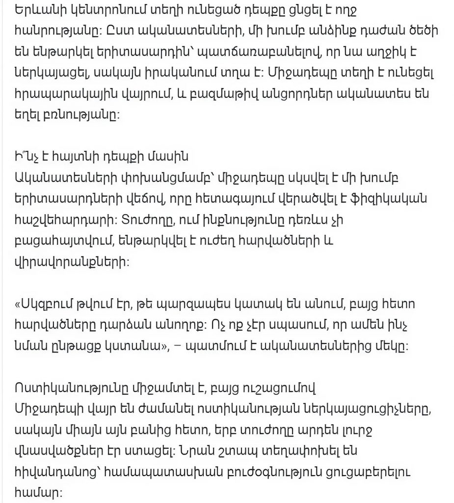 Инцидент, произошедший в центре Еревана, потряс все общество. По словам очевидцев, группа людей жестоко избила молодого человека, утверждая, что он выдавал себя за девушку, но на самом деле был мальчиком. Инцидент произошел в общественном месте, свидетелями насилия стали многочисленные прохожие.