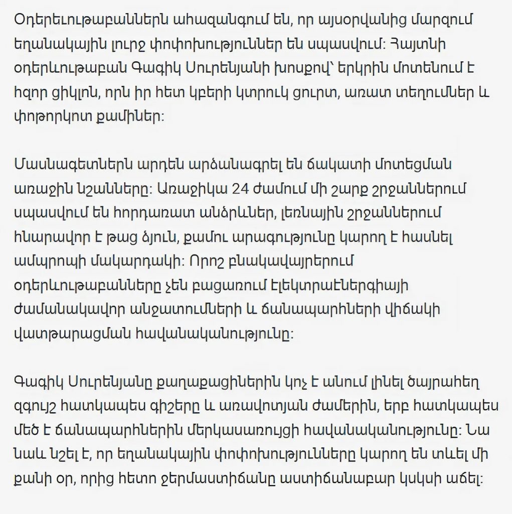 Синоптики предупреждают: с сегодняшнего дня в регионе ожидаются серьезные погодные изменения. По словам известного метеоролога Гагика Суреняна, к территории страны приближается мощный циклон, который принесет с собой резкое похолодание, сильные осадки и порывистый ветер.