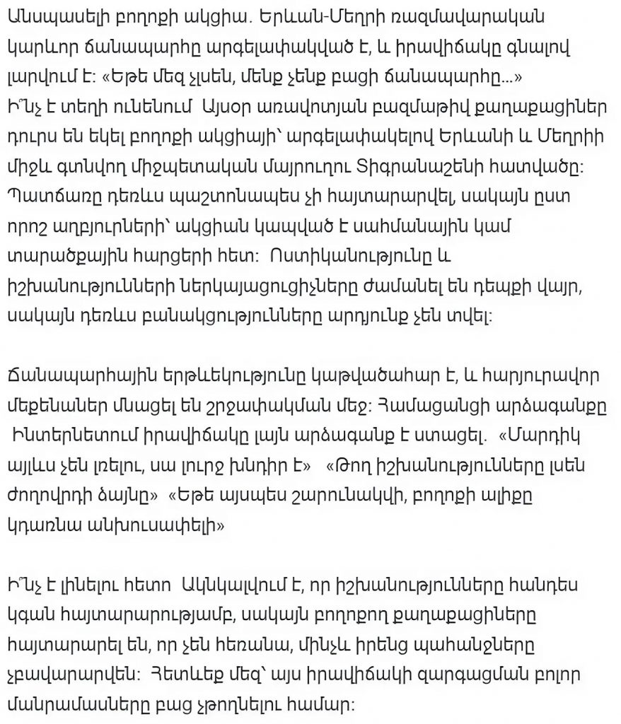 Что происходит? Сегодня утром многие граждане вышли на улицы в знак протеста, перекрыв межгосударственную трассу между Ереваном и Мегри.