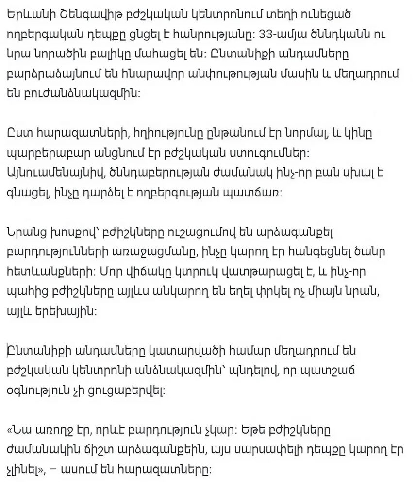 Трагический инцидент, произошедший в медицинском центре «Шенгавит» в Ереване, потряс общественность. Умерли 33-летняя мать и ее новорожденный ребенок. Члены семьи выражают обеспокоенность по поводу возможной халатности и возлагают вину на медицинский персонал.
