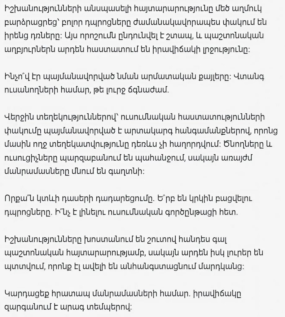 По последним данным, закрытие учебных заведений связано с чрезвычайными обстоятельствами, о которых до сих пор не разглашается вся информация. Родители и учителя требуют разъяснений, но пока детали остаются засекреченными.