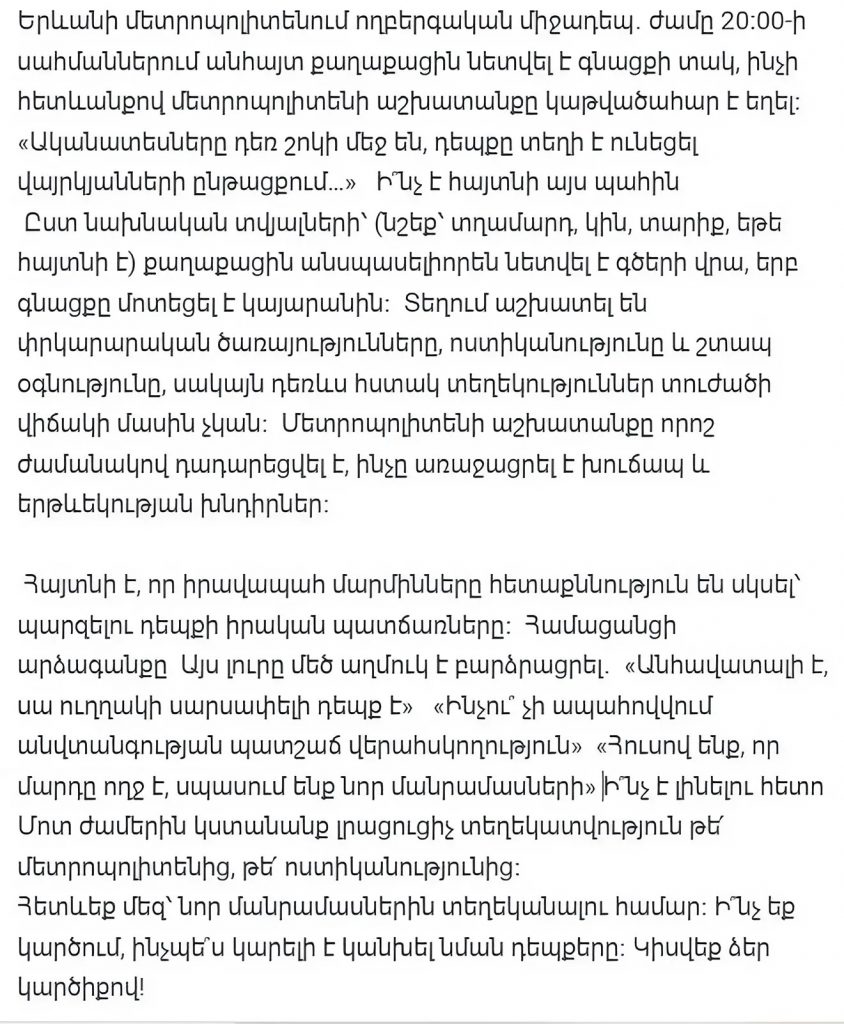 Трагический инцидент в ереванском метрополитене. Около 20:00 неизвестный гражданин бросился под поезд, в результате чего движение метро было парализовано.