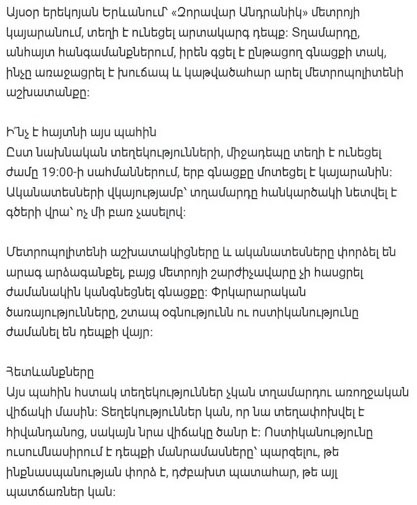 Сегодня вечером на станции метро «Зоравар Андраник» в Ереване произошло чрезвычайное происшествие. Мужчина при неизвестных обстоятельствах бросился под движущийся поезд, вызвав панику и парализовав работу метрополитена.