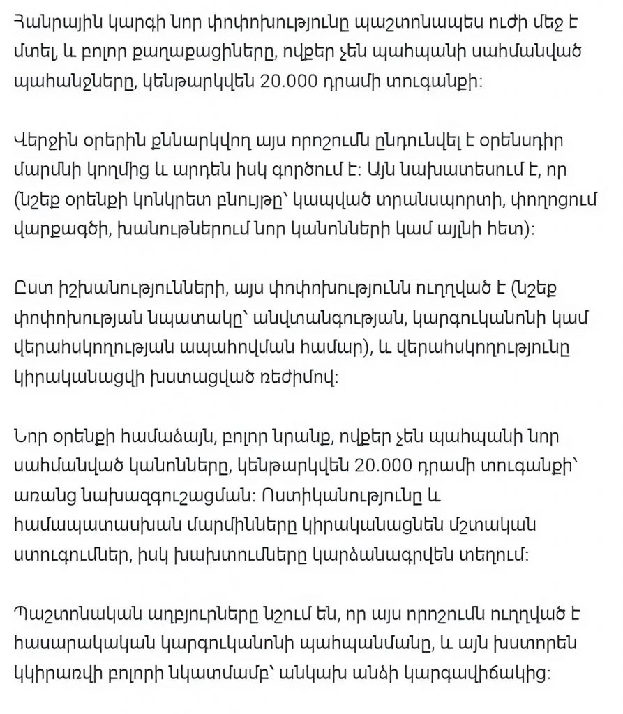 Согласно новому закону, все лица, не соблюдающие новые установленные правила, будут подвергаться штрафу в размере 20 000 драмов без предупреждения. Полиция и соответствующие органы будут проводить постоянные проверки, а нарушения будут фиксироваться на месте.