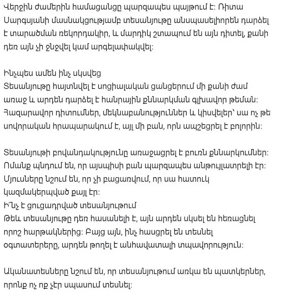 За последние несколько часов Интернет просто взорвался. Видео с участием Риты Саргсян неожиданно стало рекордсменом по распространению, и люди спешат посмотреть его, пока его не удалили или не заблокировали.