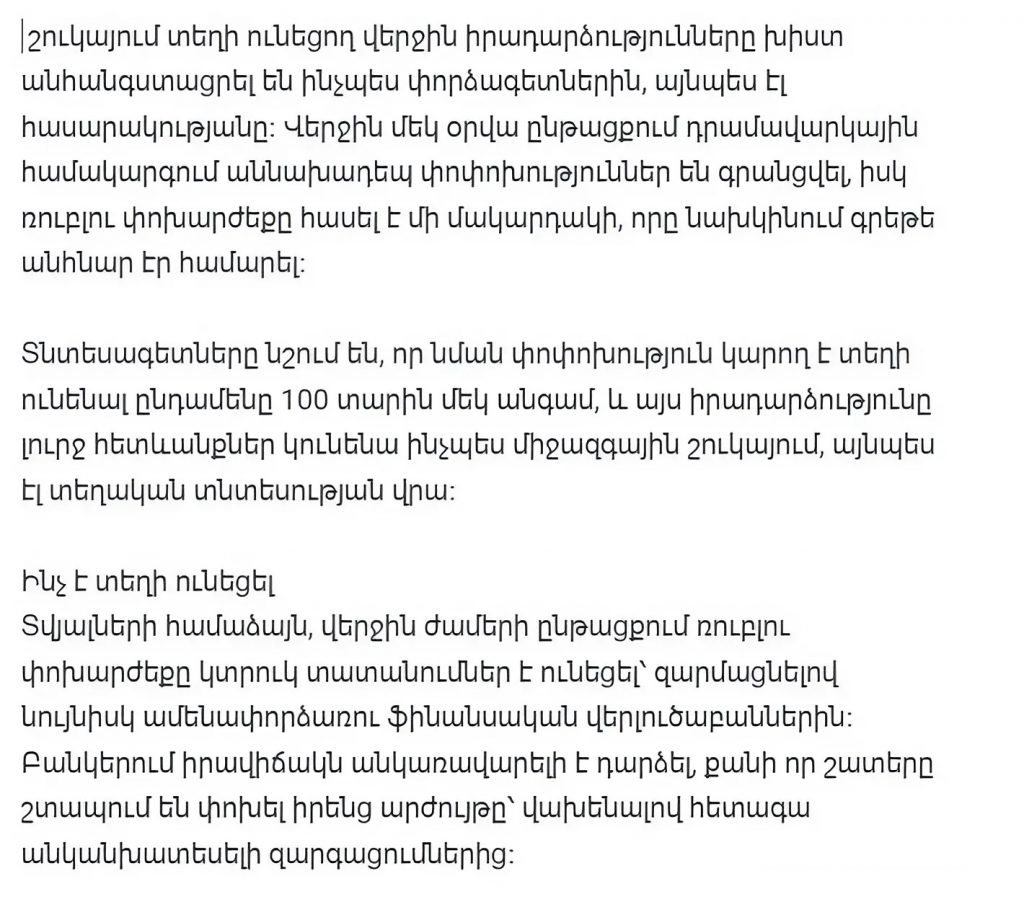 Среди населения началась большая паника, люди пытаются понять, стоит ли хранить свои сбережения в рублях или их следует срочно обменять на другие валюты. У банкоматов и обменных пунктов образовались очереди, что свидетельствует о растущей обеспокоенности общественности.